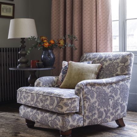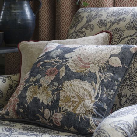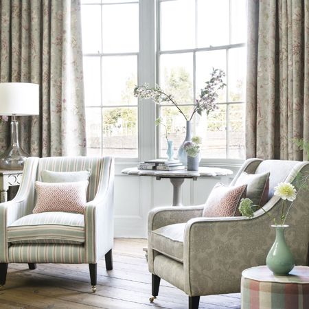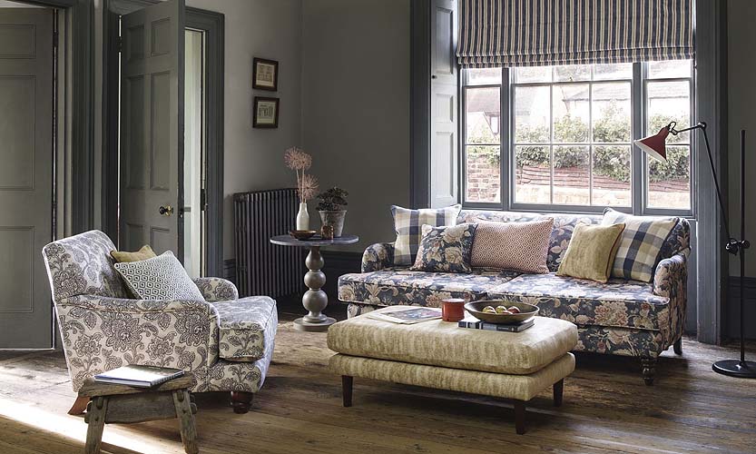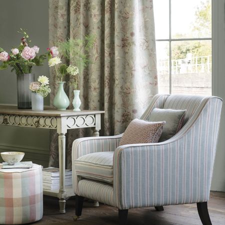 Collection of fabrics in English country style. Jacquards, vintage florals, chenille plain, stripes and checks. The perfect choice for a modern, rural atmosphere, this versatile of fabrics are suitable for curtains and upholstery.