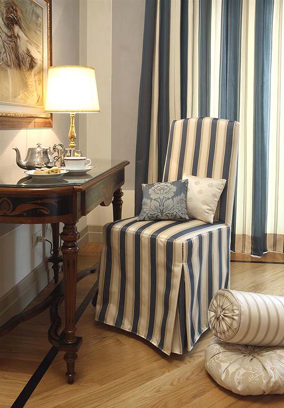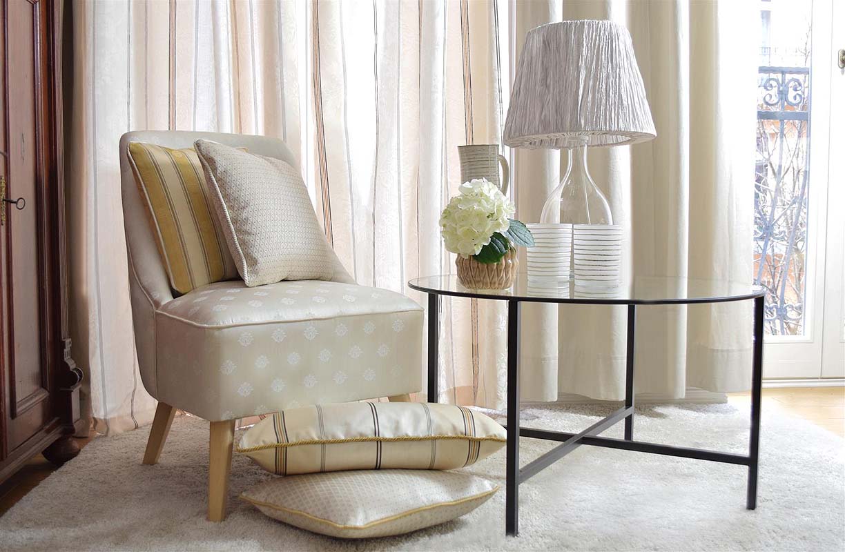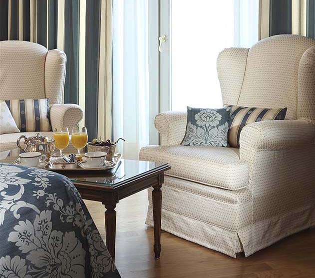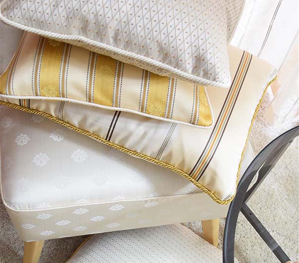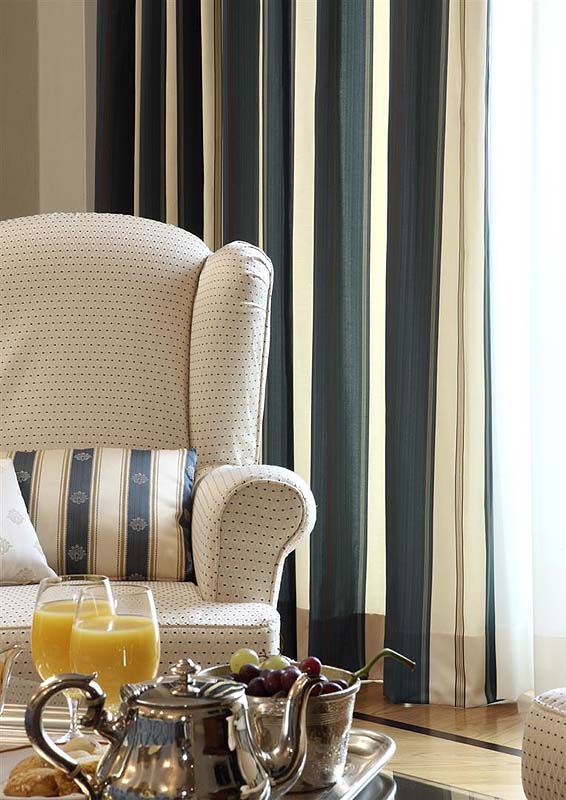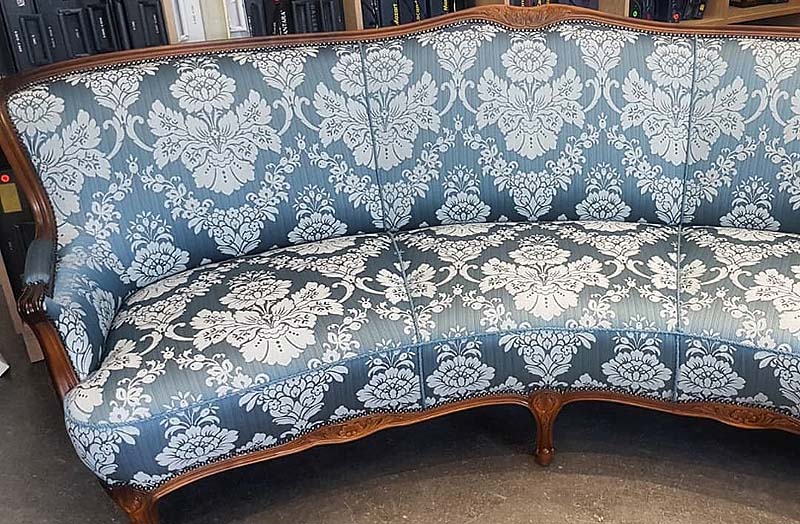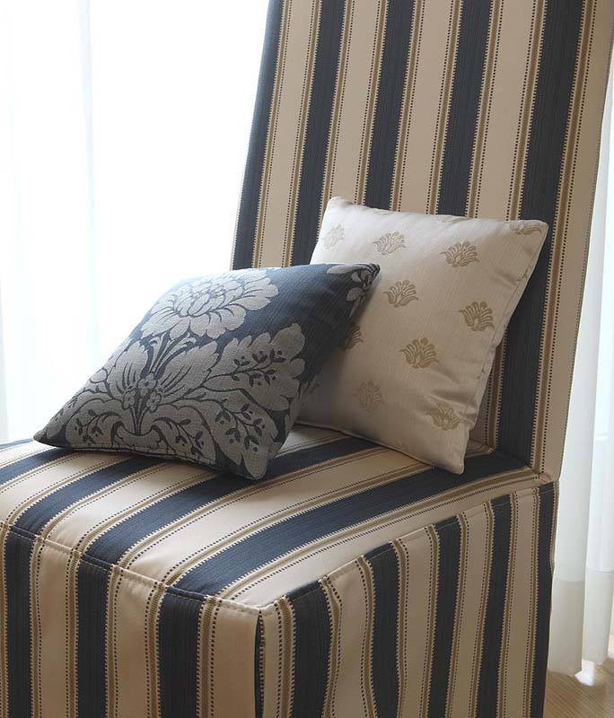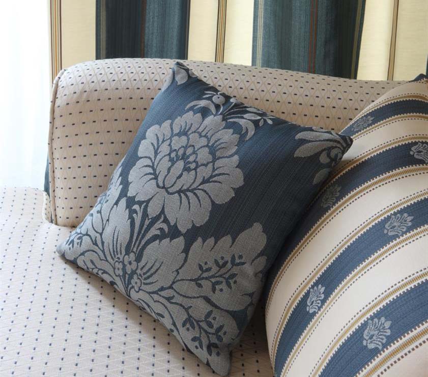 Smooth textured damask-like upholstery fabrics with classic patterns.The fabrics are double width. This has the advantage, that there are also wider banks can be upholstered without a seam in the middle. And it also makes it very suitable for bedspreads and curtains.The fabrics are flame retardant acc. Standard EN 1021 Part 1 + 2. Thus also very suitable for contract upholstery in hotels, restaurants etc.