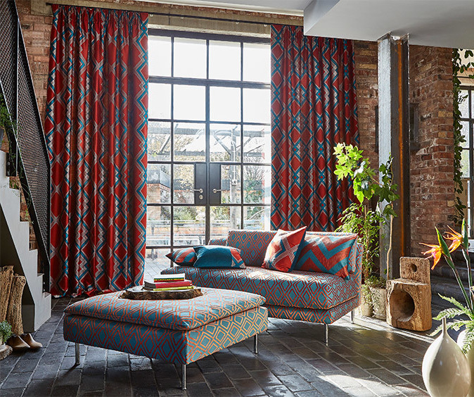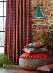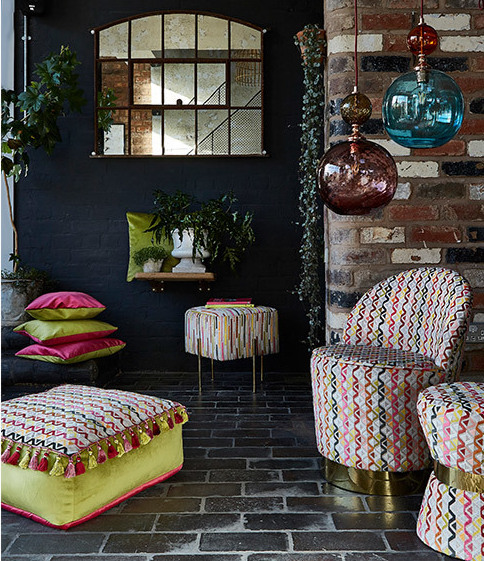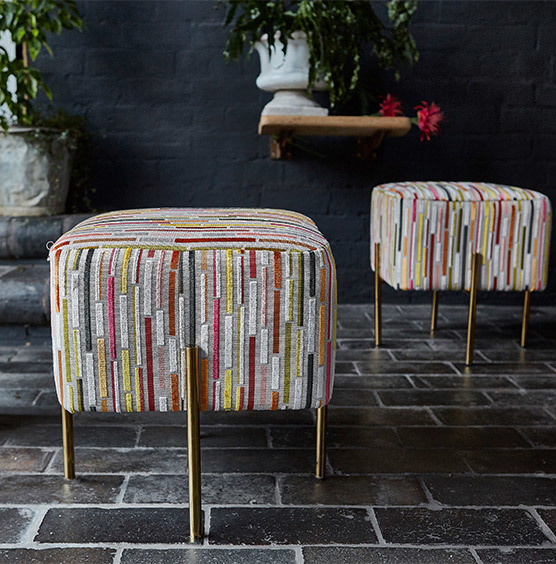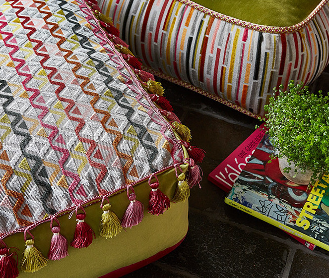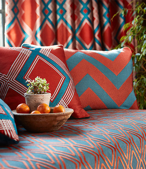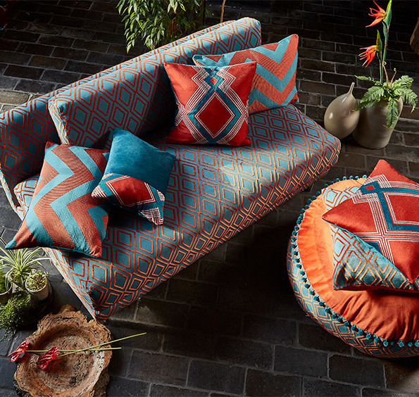 Welcome to Rio! In this lavish celebration of colour and pattern, four cut/uncut velvets display a stunning 3D effect, their bold geometrics vying for attention with dazzling jacquards and an embroidered coordinate.
