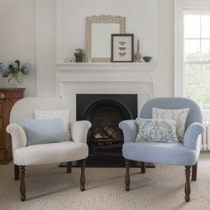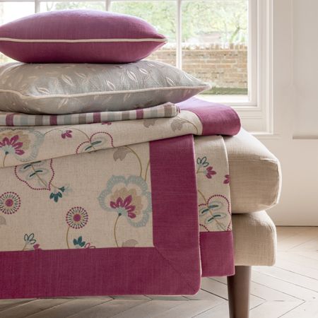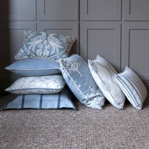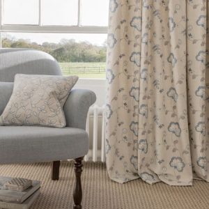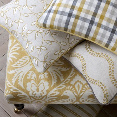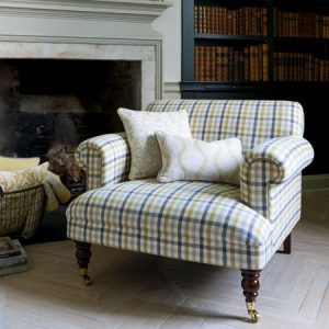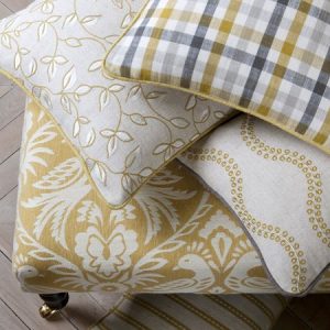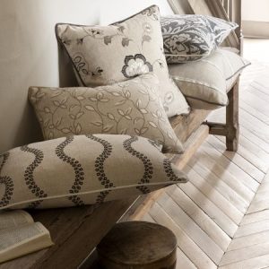 A classic collection with a mix of embroidered patterns on linen, fine woven checkered and jacquards textured curtains and upholstery, plus linen-look furniture fabric in plain colors. The chalky palette used different designs, among others. shades of sand, acacia, chambray and duck egg.