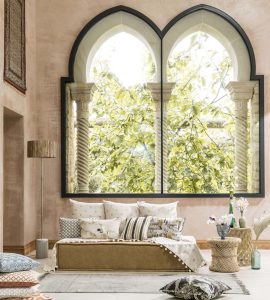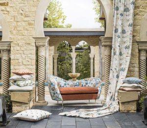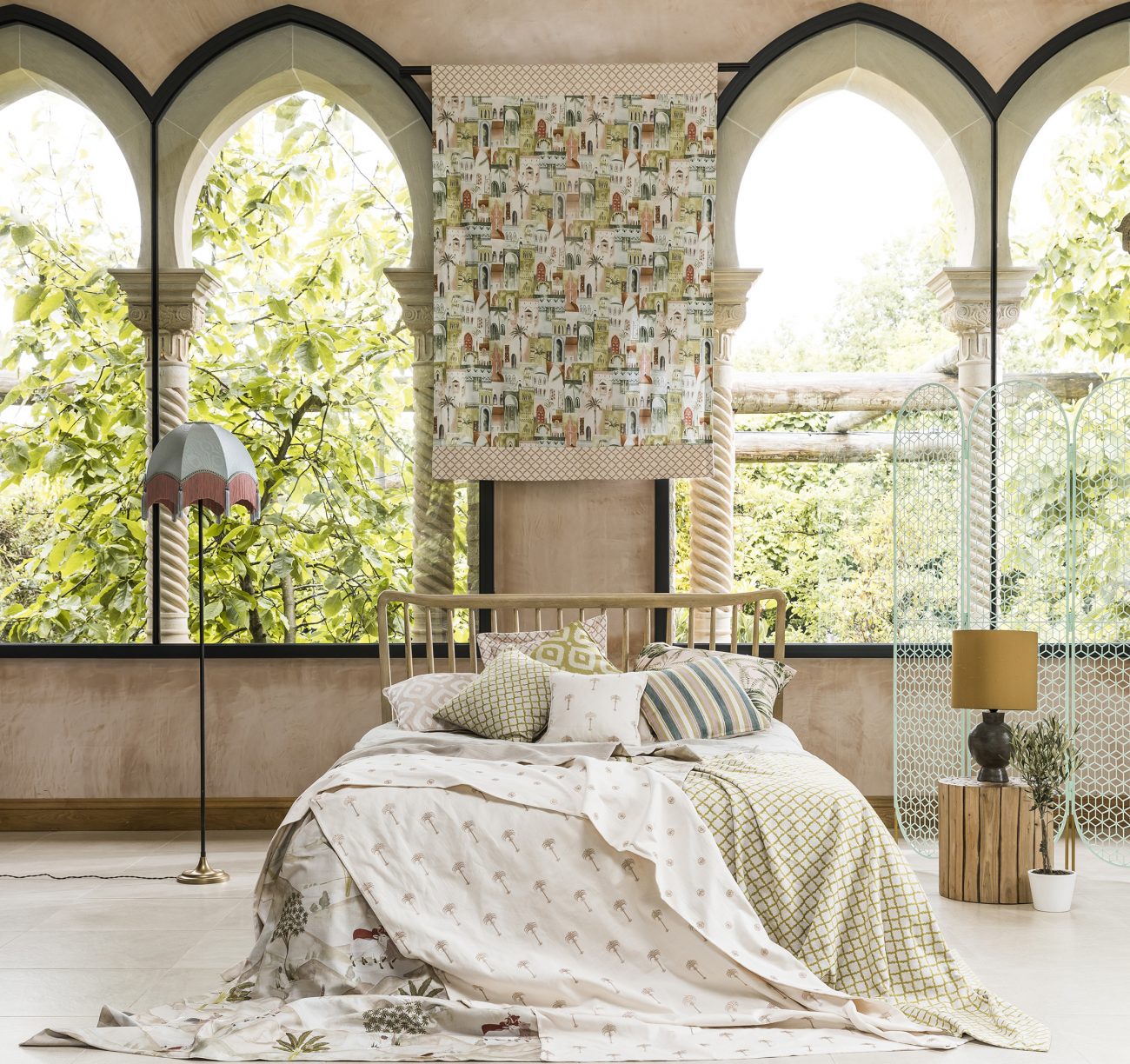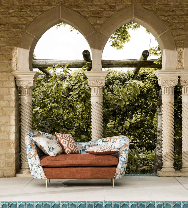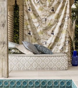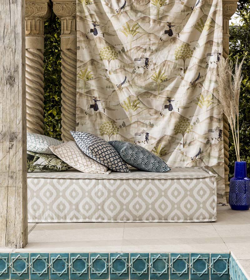 Meander through the bustling streets of Marrakech and let the Prince of Persia show you the sights and colours of this enchanting collection.Designs featuring painted palm trees, architectural geometrics and metallic threads, inspired by filigree and glimmering coins. The Prince himself features on horseback journeying across desert sands in this eclectic collection which comprises of silk inspired plains, exotic prints, with co-ordinating weaves and embroideries.