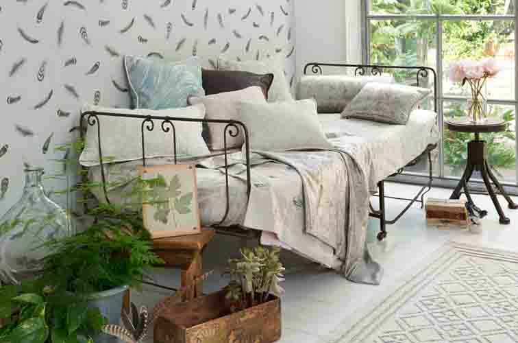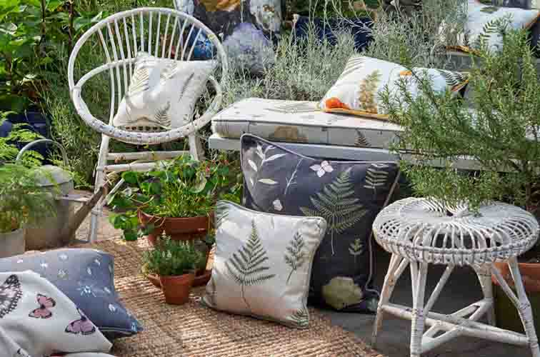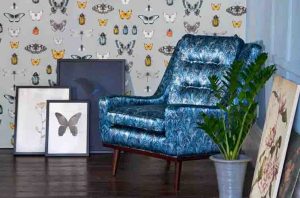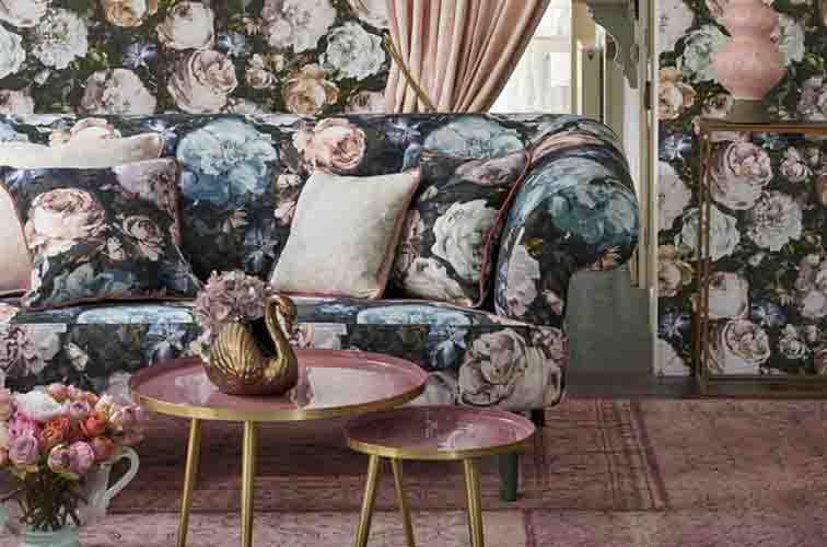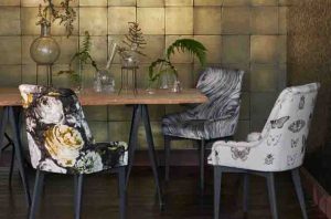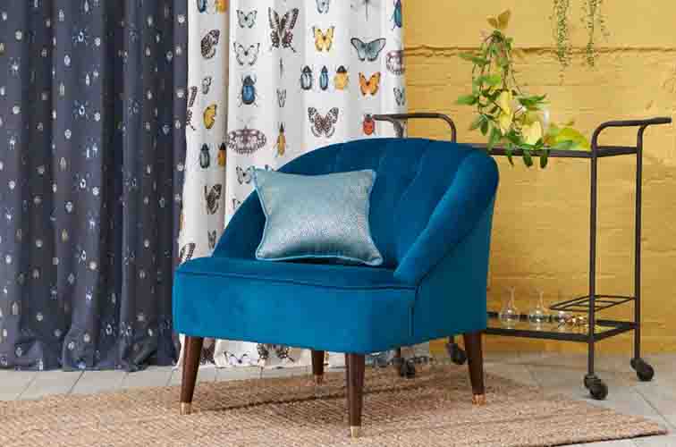 An exotic compendium of fabric, capturing the renaissance ‘cabinets of curiosities’, with a modern, more gentle twist. Hand drawn shimmering beetles, butterflies and dark painterly florals add drama, with luxurious satin and embroidery detail.