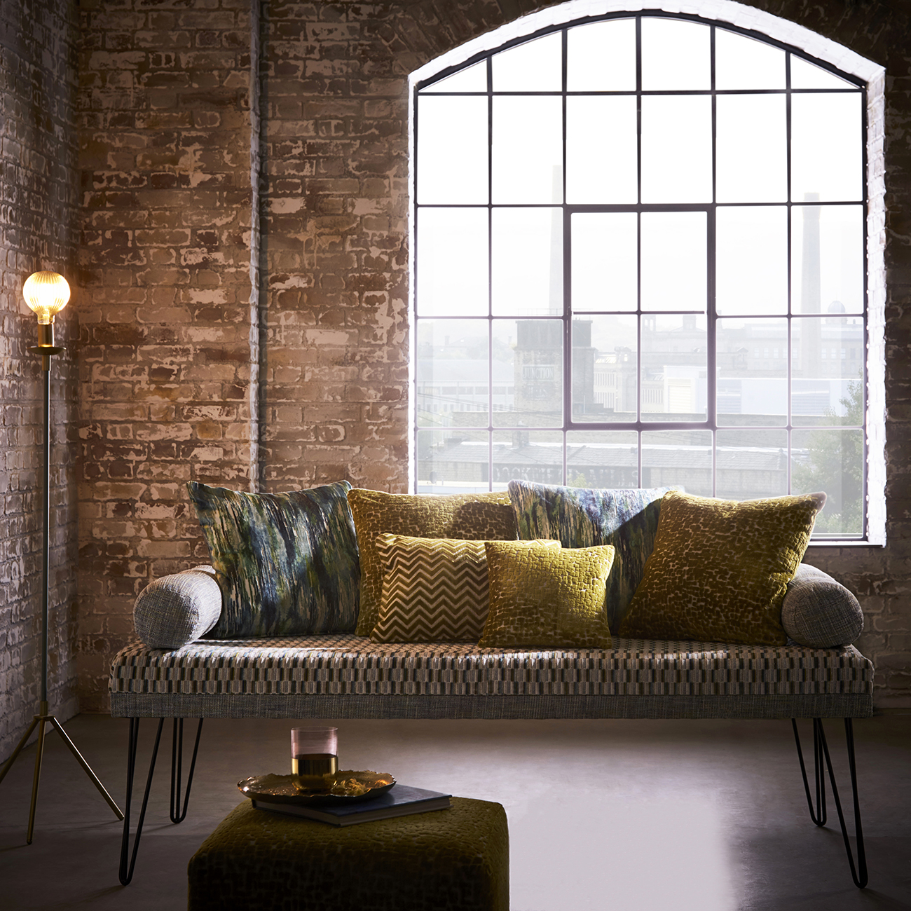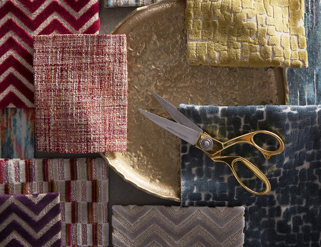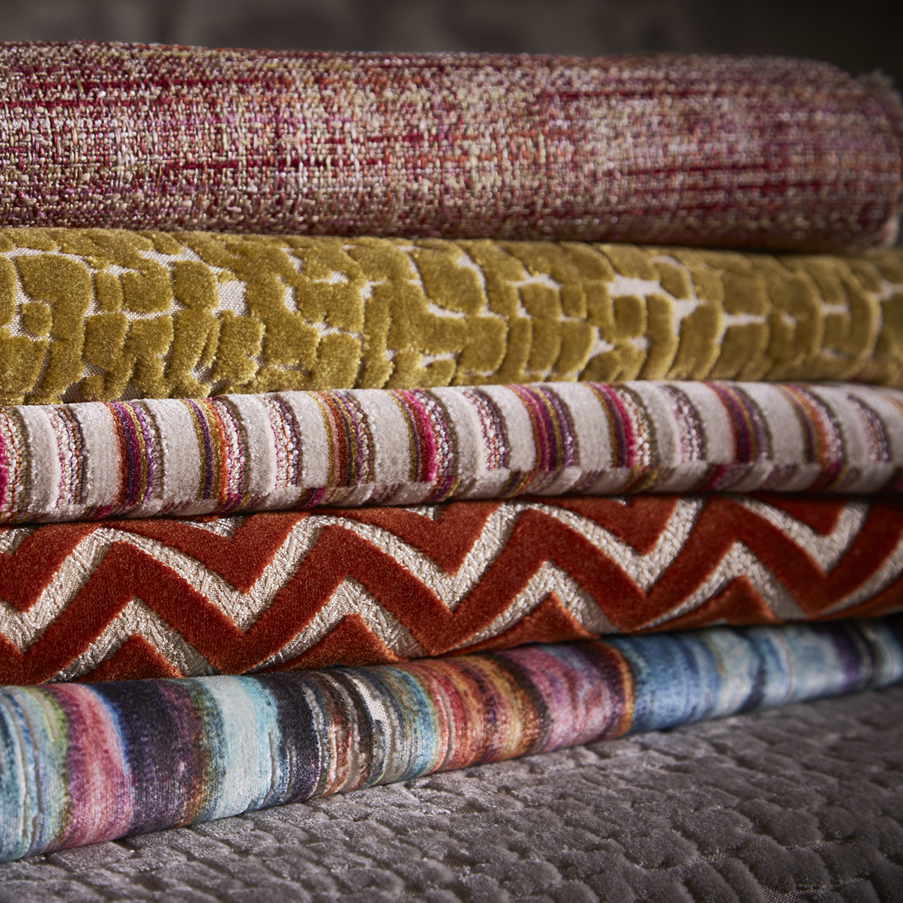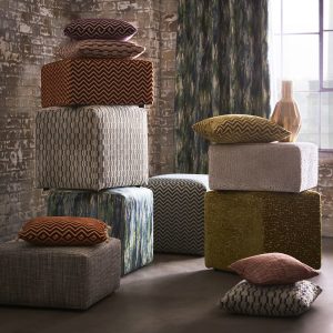 Luxueuze velours in een groot aantal modieuze kleuren brengen huiselijk comfort. Vijf ontwerpen, van impressionistische stijlen tot geavanceerde geometrie. Deze zijn verkrijgbaar in een breed scala aan kleuren, variërend van kalmerende neutrale kleuren tot levendige schakeringen van Fuchsia, Peacock en Citrus. Deze multifunctionele velours en bouclé-weefsels zijn echt boeiend.