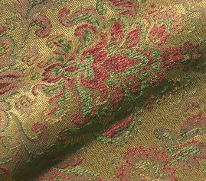 A finely woven fabric with a pattern of flowers and medallions on a shiny gold colored background. Ideal as upholstery fabrics, curtain fabric and for decorative purposes creations such as decorative pillows.