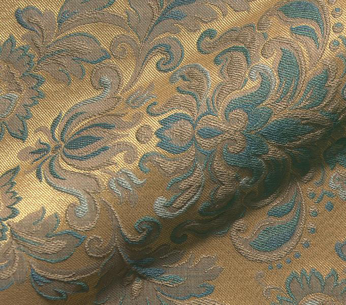 A finely woven fabric with a pattern of flowers and medallions on a shiny gold colored background. Ideal as upholstery fabrics, curtain fabric and for decorative purposes creations such as decorative pillows.