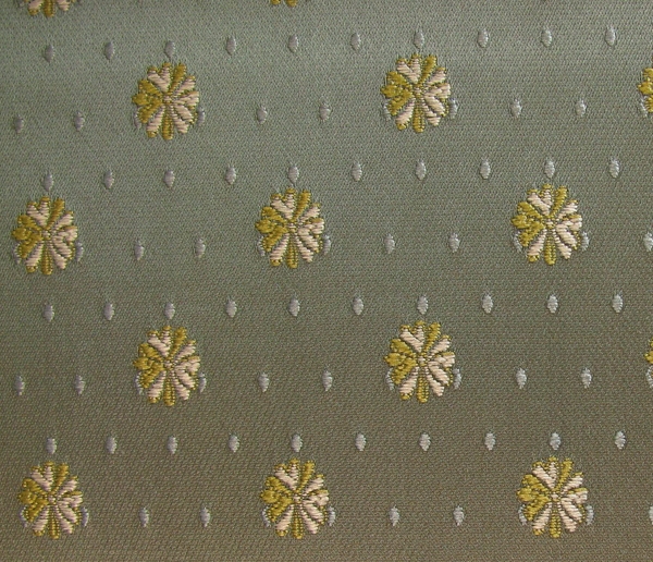 Klein klassiek patroontje geweven op een satijnen ondergrond. De stof is vlekwerend behandeld. 100% polyester dus kleurecht. Slijtweerstand 25.000 toeren Martindale. 140 cm breed.